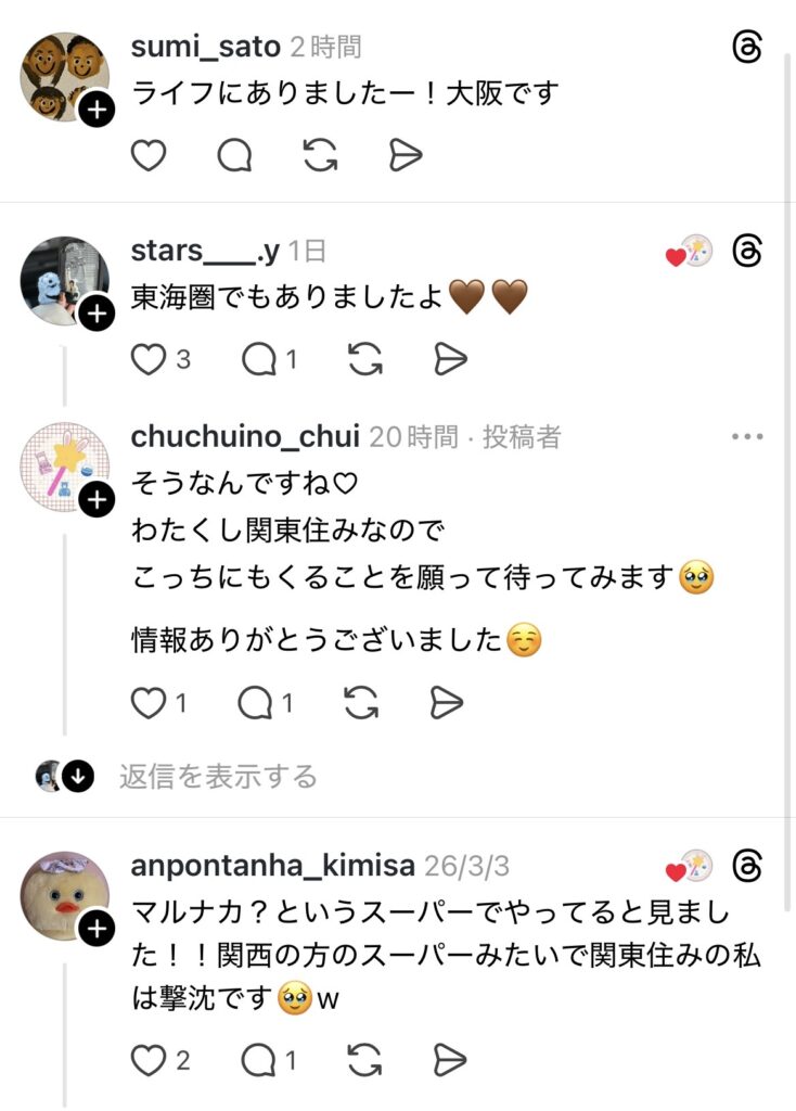 すでにゲットできた人の声を見ると、まずは大きめのスーパーを中心に探すのが良さそうだよ!