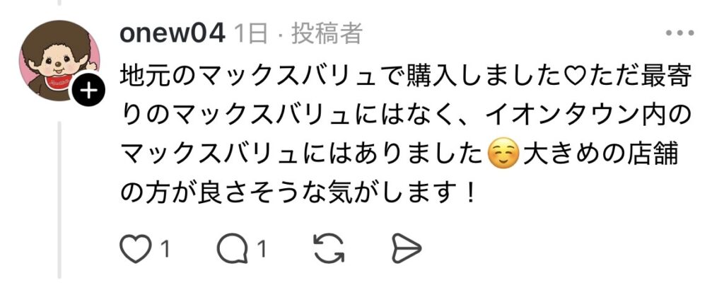 - マックスバリュ:イオン系列のため、入荷する確率が非常に高いと言えます。
