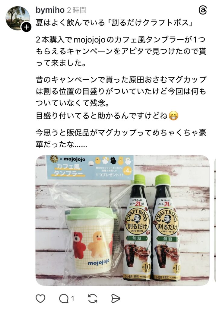 今回の記事では、尾崎歩美さんが手掛けるブランド「mojojojo」と割るだけクラフトボスカフェがコラボした、限定タンブラーの入手方法についてまとめました。