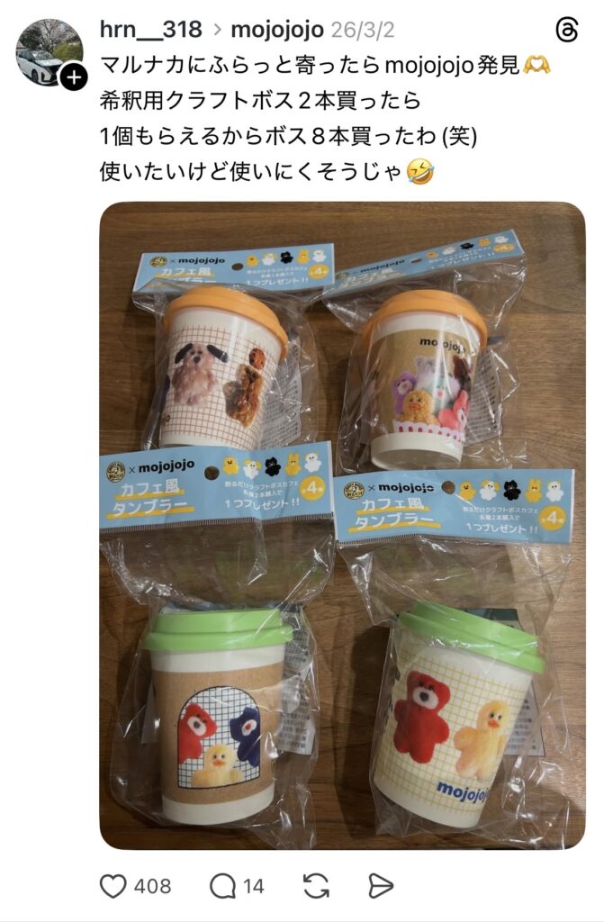 対象商品の購入で、mojojojoの可愛いタンブラーがもらえます!